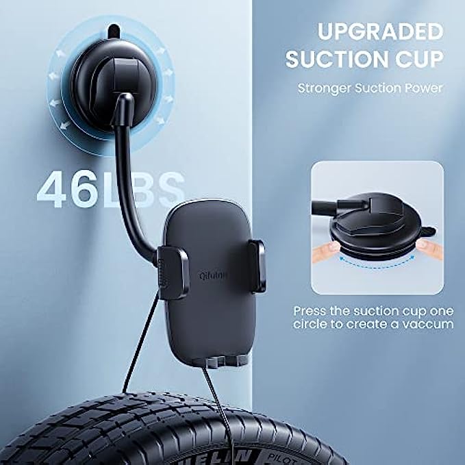 NOTE: ONLY USE THE EXTRA DASHBOARD PAD WHEN THE SUCTION CUP CAN NOT ATTACH ON THE SURFACE CLOSELY NOTE: THE CAR MOUNT NEED A BIG ENOUGH FLAT SURFACE TO MAKE THE ADHESIVE ATTACHED CLOSELY AND COMPLETELY NOTE: NOT RECOMMENDED TO USE THE EXTRA DASHBOARD PAD FOR WINDSHIELD MOUNTING Broad Vision: Qifutan cell phone car mount features a 16cm/6.2in aluminum long gooseneck that sends your phone much closer to you. It can be mounted on the windshield firmly. Most importantly, you can bend it in every direction to avoid obstructing the view Secure Steady Installation: Qifutan car mount for iphone 13/12/11 features an extra-strong vacuum suction cup with a layer of super sticky gel, a locking lever, and an anti-shake stabilizer. It sticks securely and easily on the windshield or most flat surfaces and removes the phone car mount without leaving any nasty marks. (Note: use warm water to wash the car holder's suction cup if the surface is dirty or it can not stick firmly, then let it air dry.) One-Hand Operation: Press the button on the lower back of the car mobile phone holder to take out your phone, and press the back edge of the clamping arms to secure your phone with one hand. Make your operation more fluently. Fit well for the smartphone which’s the width between 4''-7''in and the most thickness Smooth Contact: The car phone mount is padded with multiple soft silicone pads to avoid scratching your smartphone or other devices. Perfect choice for most cars, vehicle, pickup trucks, SUVs, trucks, taxis; a good assistant for Uber, Lyft drivers Ideal Viewing Angle: The car phone mount features a 360° rotating ball joint that allows you to switch it from portrait to landscape view quickly, for getting the best viewing angle. It is favorable for navigation and sending and receiving phone calls. You can enjoy a more convenient and secure drive